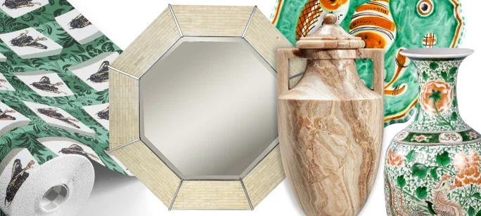 David Bowie, Laura Ashley Minotaur Wallpaper, Karl Springer Octagonal Wall Mirror, Neoclassical Style Carved Alabaster Lidded Vases , Pair of Chinese Famille Verte Dragon Vases, C.A.S. Vietri Figural Fish Plates