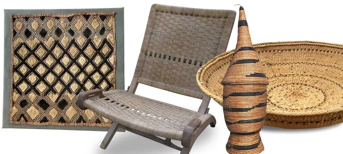 Mid 20th Century Kuba Shoowa Woven Panel , Mid-Century Modern Woven Lounge Chairs , Tutsi Agesaki Conical Basket , Brazilian Yanomami Gathering Basket